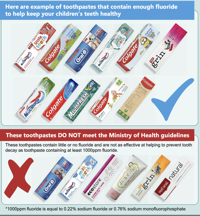 The Ministry of Health recommends everyone use a fluoride toothpaste that contains at least 1000 parts per million (ppm) fluoride* to help prevent tooth decay. Children can often use the same fluoride toothpaste as adults so long as they use the correct amount for their age. Use a half-pea sized amount of toothpaste for 0-6 year olds, or less if they only have a few teeth, for everyone else, a pea-sized amount is sufficient.