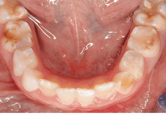 Pictures above: Hypomineralisation seen on the primary second molar, the secondary (adult) first molar and some on the primary canine. Hypomineralisation seen on the adult incisor tooth.